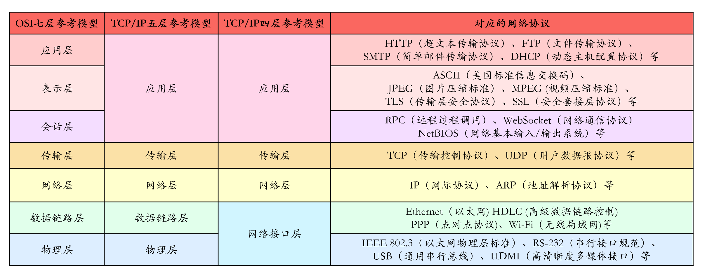 | 应用层 | 对应于OSI的应用层、表示层、会话层,提供各种网络应用服务,例如HTTP、FTP、SMTP等。 |
